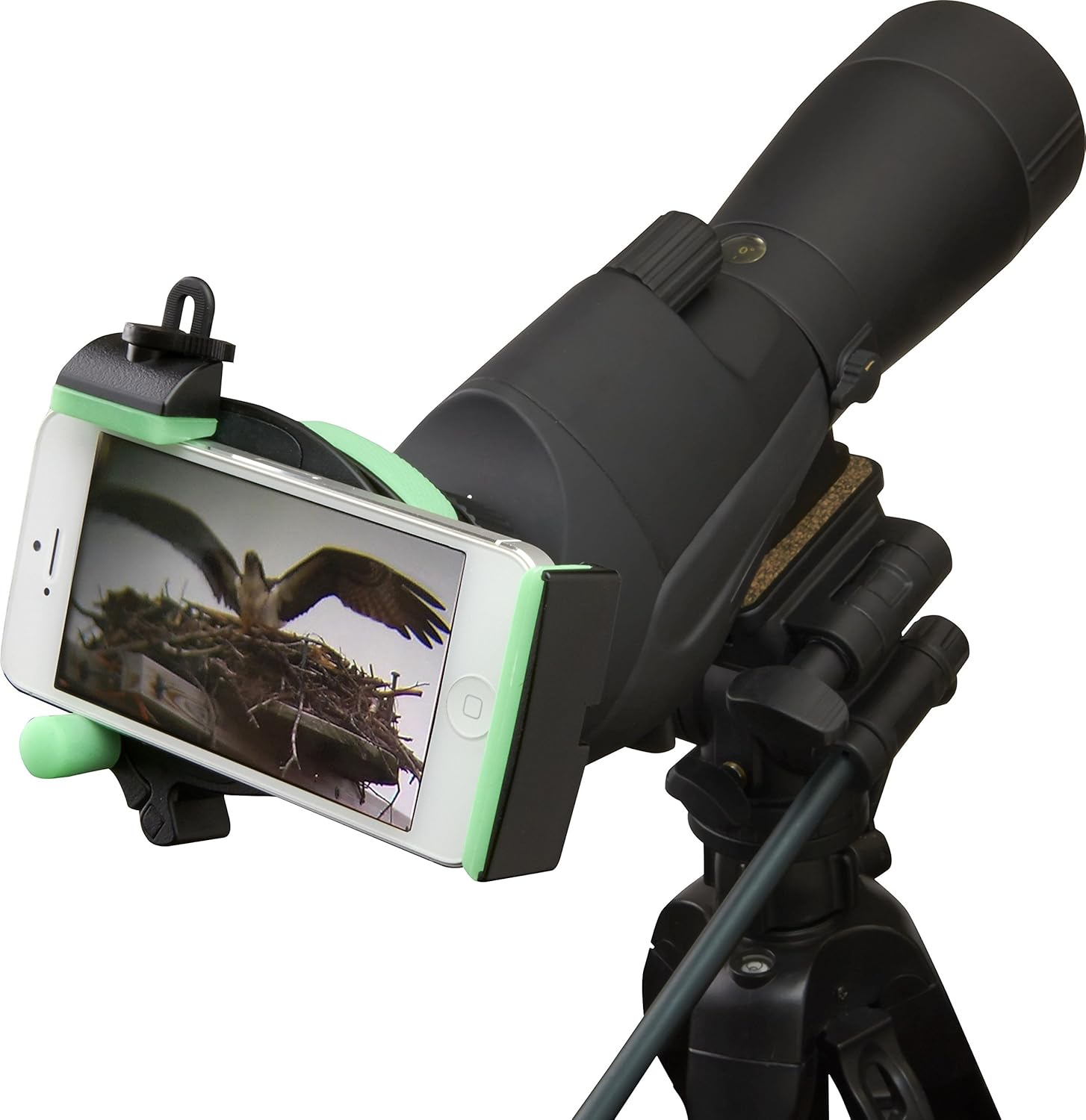 The Carson “HookUpz” universal smartphone adapter is a clever device that adapts any smartphone camera to just about any optical device, such as binoculars, telescopes, microscopes, and spotting scopes. This allows you to add the camera you already have to the optics you already have.